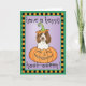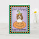Senden Sie Halloween-Grüße mit dieser Karte eines niedlichen Springerwelpen in einer lächelnden Kürbislaterne. Groß für Kinder alles Alters das Liebe englischer Springer-Spaniels und Halloween. Haben Sie ein glückliches Heulen-oween!