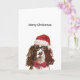 Weihnachtskarte vom englischen Springer Spaniel. Englisch Springer Spaniel mit einer Bogen-Krawatte, Glas und Weihnachtsmannmütze.