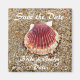 Coquille de pétoncle de couleur rouille reposant sur une plage de sable. Conception unique de sauvegarde à jour pour votre mariage ou autre événement.