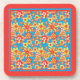 Un ensemble de Dessous de verre à dossier de liège à la campagne, avec un motif de fleurs rouges, orange et jaunes sur un arrière - plan turquoise brillant, d'un collage de papier peint à la main par Judy Adamson, avec une bordure rouge vif.