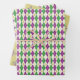 Des diamants vifs, violets et verts, ornés de silhouettes de diamants dorés et de fleur de lis, rappellent les réjouissances et les fêtes associées à un Mardi Gras de la Nouvelle-Orléans, tandis qu'une base crème apporte une touche de raffinement à ce motif Jacquard. Deux draps de cet ensemble sont exclusivement composés du motif de Jacquard, tandis que le troisième est orné d'un motif de fleur de lis décoré avec le motif de Jacquard sur un arrière - plan d'or défraîchi pour vous offrir des options et une variété pour votre emballage cadeau ou vos projets do-it-yourself.