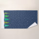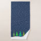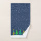 Un dessin géométrique moderne de cinq sapins en vert, turquoise et jaune d'or. Le ciel est marine avec la neige en baisse blanche.