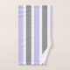 Cet ensemble assorti comprend une lavande, une serviette à main rayée grise et blanche et un linge de toilette, ainsi qu'une serviette de bain lavande.