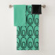 Ce kit de serviettes comporte un linge noir, une serviette verte à la menthe et une serviette de bain au design moderne du milieu du siècle d'un petit ovale à l'intérieur d'un ovale plus grand sur un champ vert menthe.