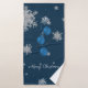 Ajoutez une touche festive à votre décor de salle de bain en cette période de vacances avec un ensemble de serviettes d'ornements de Noël bleu. Les serviettes sont décorées d'un trio d'ornements de Noël suspendus avec des flocons de neige en chute et un arrière - plan bleu foncé. Autres cadeaux et objets de vacances disponibles avec ce design aussi.