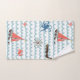 Ensemble moderne, élégant, mignon et amusant de serviettes avec des illustrations nautiques de voiliers, poulpe, crabes, étoiles de mer et autres accents nautiques.
