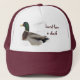 Dieser Hut kennzeichnet eine Stockentenente, sehr überrascht, sich zu finden umgeben durch flaumigen weißen Schnee von einem frühen Sturm. Sein reizender grüner schillernder Hals, gelber Schnabel und verwickelt gemusterten Flügel stehen wirklich heraus gegen alles, das Weiß! Der Text liest: Lord-Liebe eine Ente. Sie kann besonders angefertigt werden oder entfernt werden.