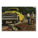 Illustration vintage de l'industrie des affaires mettant en vedette un architecte et un entrepreneur général debout à côté d'un camion de travail jaune. Les hommes à col bleu examinent des plans de blueprint sur un chantier de construction avant que l'inspecteur ne se présente pour donner son approbation pour le projet.