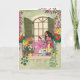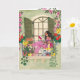 Mädchen, die auf dem Sommerbalkon mit ihrer Katzen-Illustration lesen und jemandem einen entspannten Geburtstag wünschen. Original-Kunstwerk von Caroline Bonne Müller.