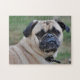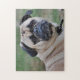 Eine Fotografie eines entzückenden Mops mit einem Stück Gras haftend aus seinem Mund heraus, wie er in die Kamera anstarrt.