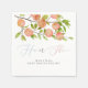 Peach Thema Geschlecht zeigen Party Papier Serviette. Abbildung der Gartenfrüchte auf einem Baumzweig in Aquarellfarbe mit dem Text "er oder sie" Der Text unten sagt "WAS WIRD BABY XX SEIN?"