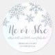 Winterwunderland thematisches Geschlecht offenbart Aufkleber. Ein wunderschönes Baby-Rosa und blauer Himmelshintergrund mit schimmernden Silberschneeflocken im Glitzer. Text: "Er oder sie, was wird unsere kleine Schneeflocke sein?"