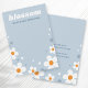 Die Schmuckkarte mit weißer Erdbeerblüte auf einem staubblauen Hintergrund und Ihrem Firmen- oder Designnamen in einem Retro-Schriftart.