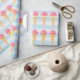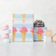 Papier mit einem sich wiederholenden Muster umhüllen. Eine köstliche Eistütenillustrierung mit einer Kugel rosa Erdbeereis, das von einer Waffelkone gehalten wird. Hintergrund ist ein Muster von blauen Streifen.