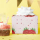 Ein hellrosa Wrapping Paper mit Strawberry-Muster und Polka-Punkten. Eine gute Idee für ein Geschenkpaket für ein Kind oder einen Liebhaber von Gemüsebeeren!