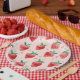 ErdbeerpapierTeller mit zusammenpassenden Papierservietten. Sehen Sie mehr Mischung und bringen Sie Produkte in der Erdbeersammlung bei https://www.zazzle.com/collections/strawberries_collection-119030629393964165 zusammen
