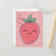 Eine lustige Cartoon Erdbeere mit dem niedlichsten Lächeln, ein rotes Gesicht und grüne Blätter oben mit rosa Liebe Herzen.