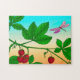Puzzle in einer digitalen Darstellung reifer Erdbeeren auf einem Zweig smaragdgrüner Blätter vor einem weichen, orangefarbenen bis türkisfarbenen Hintergrund, Sonnenuntergang Himmel, besucht von einer lila geflügelten Libelle