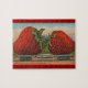 Antique Funny Giant Strawberry Train - Diese Erdbeerauswertung basiert auf einer Postkarte aus dem Jahr 1911, die zwei gigantische Erdbeeren zeigt, die mit dem Zug quer durch das Land transportiert werden. Die Erdbeeren sind größer als ein Haus! Es handelt sich um riesige Erdbeeren, die für Riesenmenschen gedacht sind, die irgendwo in den Fernen des Erdbeerkönigreiches leben! Die Erdbeeren sind etwa so groß wie ein Haus, helle rote Beeren, und sitzen auf einem flachliegenden Zugbett und rollen die Bahngleise hinunter.