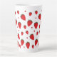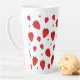 Eine latte Tasse mit Erdbeermuster mit den Früchten in verschiedenen Größen in rot und weiß.