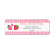 Ein Trio aus rosafarbenen und beerroten Erdbeeren mit einem Hintergrund, der das weiße Rechteck in rosa und weiß Karo umgibt. Composite Design von Hoilday Hearts Designs.