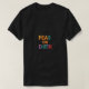Der T - Shirt-Entwurf enthält den Begriff "Erbsen auf Erden" in einem fett gedruckten, geometrischen Schriftart, wobei jeder Buchstabe in einer anderen lebendigen Farbe dargestellt wird. Der Text wird auf einem schwarzen T - Shirt gedruckt, und das Bild wird mit einer flachen Feldtiefe fotografiert.