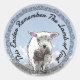 Dieser Aufkleber zeigt ein Lamm, das auf einem Foto Wolken in einem blauen Himmel angezeigt wird. Eine Blumengrenze umkreist die Runde. Die Worte "Dieses Ostern erinnere dich an das Lamm Gottes" kurven um die obere Hälfte der Runde herum.