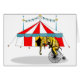 Circus Elephant reitet Fahrrad mit rotem und weißem Zirkuszelt