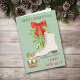 Hier ist eine hübsche Weihnachtskarte mit nostalgischem Flair. Die Vorderseite zeigt eine Aquarellbildergruppe mit einem immergrünen Teig mit einem roten Bogen, einem Eis-Skate und einer dekorativen Tasse heiße Schokolade. Der grüne und rote Text sagt "NUR CHRISTMAS" und "GLÜCKLICHES NEUES JAHR". Die Innenseite hat ein Textfeld, das Sie ändern können, wenn Sie möchten, und ein Bild eines roten Poinsettienbukets.