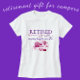 Ein niedlicher, Vintager Wohnwagen mit Markisen, Herz und Vogelkäfig in einem der Fenster. Die Worte: RETIRED und Camping glücklich immer wieder, sind über dem lustigen fröhlichen Trailer. Das Design ist rosa und lila. Feiern Sie Ihren Ruhestand und Geschenk selbst oder eine Leckerei ein Freund.