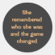 "Sie erinnerte sich daran, wer sie war, und das Spiel veränderte sich." Das einfache, elegante Zitat und die weibliche Ermutigung mit einfachem Text auf dem klassischen Rundaufkleber ist vollständig anpassbar, Sie können es nach Ihrer Wahl ändern