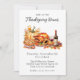Diese individuelle Einladung besticht durch ein elegantes Erntedank-Dinner-Thema. Im Zentrum befindet sich ein Aquarellbild mit verschiedenen Speisen und Blumen aus einem Abendessen am Erntedank. Zwischen einem Apfelkuchen und einer Flasche Wein liegt ein gerösteter Truthahn. Hinter dem Fest befindet sich ein festlicher Kürbis und ein Laub.