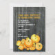 Ein Erntedank-Dinner mit einem Barnwood-Hintergrund auf der Vorder- und Rückseite. Vorderseite zeigt einen Haufen von kleinen und großen Kürbissen unten mit der Wirkung von gechippter Farbe. Personalisieren Sie den Orange und den weißen Text mit Details Ihrer Gelegenheit.