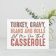 Dieses lustige und festliche Erntedank-Design enthält den spielerischen Satz "Turkey, Gravy, Bohnen and Rolls, Lass Me See That Casserole" in einem kühlen, auffälligen Layout. Der Text ist in einer Mischung aus blockartigen, bedrückten Schriftart und eleganten Schriften angeordnet, die einen dynamischen und fesselnden visuellen Effekt erzeugen. Die Farbpalette ist in warmen, erdigen Farbtönen wie Braun, Orangen und Rot gehalten und spiegelt die gemütliche und gemütliche Atmosphäre eines Erntedanks wieder. Die bedrückte Textur des Textes verleiht dem Design ein rustikales, Vintages Gefühl, das es ideal für den Urlaub macht.