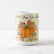Personalisieren Sie diese einzigartige "One of a Kind" Erntedank Pumpkin Tasse! Es verfügt über einen wunderschönen Orangen Kürbis, umgeben von Herbstlauben in Orangen- und Grüntönen mit Orangen Berries und Braunen Pilzen und dem Christlichen Zitat..."In allem gibt Dank!"! Dies ist ein Original Art Design von Künstler Kerry Miller.