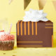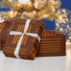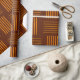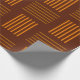 Dieses Verpackungspapier hat ein modernes Design Mitte des Jahrhunderts, das wie ein Gewebe mit orangen und braunen Linien auf einem Feld dunkelbrauner aussieht.