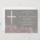 Diese elegante und hübsche Einladungskarte für die erste heilige Kommunion verfügt über eine kreuz-illustrierte, rosafarbene Blume am unteren Rand. Die Hintergrundfarbe und der Text können auf Ihre Wünsche für Ihr religiöses Sondersakrament abgestimmt werden.