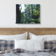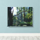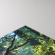 Brillante, weiße Sonnenstrahlen der Morgensonne, die von hinter dunklen Ästen in einen üppigen, grünen Sommerhwald strömen, mit massiven Efeu-Bäumen und fruchtbarem Unterholz.