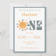 Erste Reise um die Sonne erste Geburtstagseinladung. 1. Geburtstag geschlechtsneutrales Party- oder Mädchenthema. Glückliche niedliche, leuchtende Sonnengrafik mit erdigen Tönen. Schriftart mit schönem, hellen Hintergrund, passendes Party-Dekor Set, grün-gelb-orange Pastellfarben