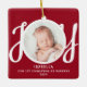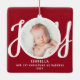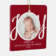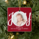 Dieser Sake First Christmas As Parents Foto Ornament ist mit dem Wort JOY in stilvollen Schrift Typografie auf einem roten Hintergrund dekoriert. Einfach anpassbar.