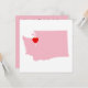 Eine hübsche Einladung zur Washington Hochzeit in Urlaubsort in Rosa und Weiß. Das rote Herz liegt in der Metrozone von Seattle, Tacoma oder Olympia, aber man platziert die Form, in der sich Ihre Stadt oder Stadt befindet. Sie können die Farbe des Staat auswählen, indem Sie die Hintergrundfarbe entsprechend Ihrer Hochzeitspalette ändern. Sie können die Kontur der Staat-Form auch auf der Rückseite der Einladung kopieren und einfügen, wenn Sie sie auf beiden Seiten bevorzugen. Erstellen Sie Ihre eigene individuelle Einladung, indem Sie den modernen Script-Schriftart Stil ändern. Passen Sie die Größe des Schriftartes an, um mehr Informationen über Ihren Hochzeitsort zu erhalten. Es gibt viele schöne Schriftart Stile zu wählen.