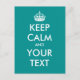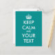 Vollständig anpassbare Postkarte "Keep Calm and Carry On" basierend auf dem britischen Poster des 2. Weltkriegs! Sie können den Text ganz einfach ändern, indem Sie in die Textfelder eintragen und Ihre Lieblingsfarbe für den Hintergrund auswählen! Sie können sogar eigene Bilder hinzufügen oder das vorhandene Kronenbild verändern. Schaffen Sie sich kreativ und drücken Sie sich aus! :-)