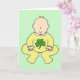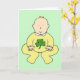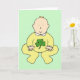 Ein niedliches Cartoon-Baby in einem Zitronenoutfit mit einem Kleeblatt auf dem vorderen Set vor einem flachen grünen Hintergrund.