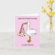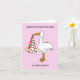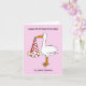 Eine einfache Abbildung eines Weißstorches, der ein Baby in einem weißen Blatt hält, das vom Schnabel hängt. Das Blatt hat rote Herzen und das Bild ist Set vor einem blassrosa Hintergrund. Die Worte "Happy First Valentine's Day als neue Eltern" begleiten das Bild.