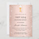 Eine Rose goldener Hintergrund. Dekoriert mit Rose Gold Konfetti, einem Kalice und einem Gastgeber. Personalisieren und fügen Sie einen Namen und Details. Der Name wird mit einem handgeschriebenen Stilskript geschrieben