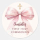 Creme, beige Unterlage. Die Einrichtung besteht aus einem großen rosa Bug und einem goldenen Kreuz. Personalisieren und fügen Sie den Namen hinzu.