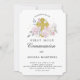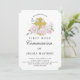 Die hübsche First Communion Einladung besteht aus einem goldenen Kreuz, umgeben von Rosen in Rosa und Salbei-Grün-Blätter. Traditionelle Schriftart geben dieser Einladung ein klassisches Aussehen.