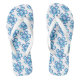Erwachsenenflip-Flops perfekt für den ganzen Sommerspass, hier in Weiß dargestellt mit einem farbenfrohen blau-violetten Blumendruck mit weißen breiten Riemen und weißen Fußbett. Passen Sie dieses Objekt an oder kaufen Sie, wie es ist.