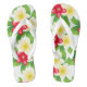 Erwachsene Flip Flops sind in Weiß mit einem schönen tropischen Blume-Druck dargestellt. Passen Sie dieses Objekt an oder kaufen Sie, wie es ist. Verwendetes Bild