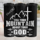 Dies ist ein grafisches Design-Stück mit einem spirituellen Satz in einem stilisierten, bedrückten weißen Schriftart. Der Text ist Set auf einem einfachen, hellgrauen Hintergrund. Der Satz lautet: "ERZÄHLEN SIE IHREN BERG ÜBER IHREN GOTT" und wird begleitet von einer stilisierten Kontur einer Bergkette und eines Kreuzes. Das Design umfasst auch dekorative Pfeile und eine Diamantform. Die Ästhetik insgesamt ist leistungsstark und minimalistisch und eignet sich für eine Vielzahl von inspirierenden Produkten.